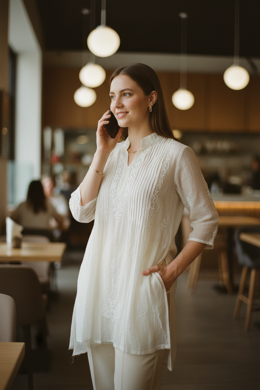 Upgrade your wardrobe with the Mul Mukesh Shirt from Stitch Story. This short kurti is perfect for women who love semi-formal ethnic wear. It features delicate Mukesh embroidery on premium Mul Chanderi fabric, giving a traditional yet stylish look. Ideal for office parties, festive occasions, or casual semi-formal gatherings.